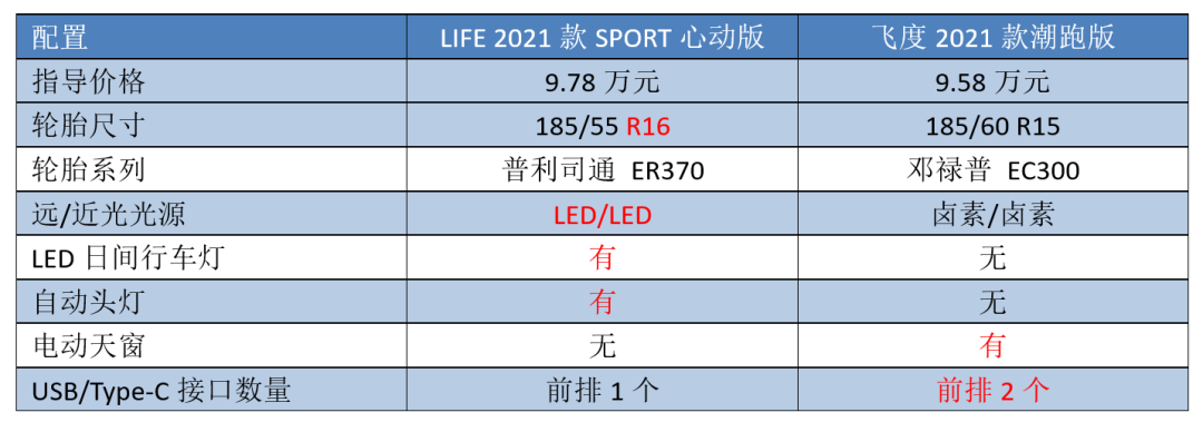 从表格中可以非常直观地看到,尽管LIFE 2021款SPORT心动版指导价格比飞度2021款潮跑版贵了2000元,但是多出16寸轮毂、普利司通泰然者系列轮胎、LED远近光、自动头灯以及LED日间行车灯等实用配置,多后者则是比前者多出了电动天窗以及1个充电接口。
